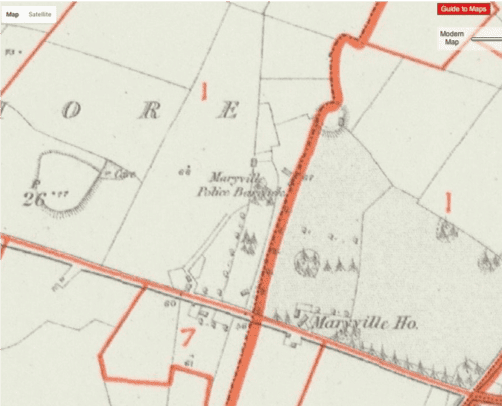 Sarah would not have lived at this Maryville House but in the old Maryville House which no longer existed but was shown on the 1841 ordnance map. It had stood close to the entry gates. The current Maryville House is an extension of the old Maryville Police Barracks which dated from the 1820s. The Police Barracks are on the 1841 ordnance map on the other side of the road from the old Maryville House.