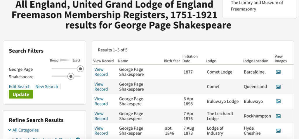 The Freemasonry records on Ancestry.com are found in the ‘Category of Professional & Organisational Directories’ within ‘Schools, Directories & Church Histories’. Limiting your name search to these categories will soon reveal all the United Grand Lodge of England Freemason Membership Registers from many English-speaking countries.