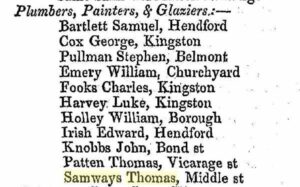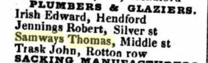 Else Churchill also discussed the value of local directories when searching for information about ancestors. In the case of Thomas Samways he appeared as a plumber and glazier in directories such as the Universal British Directory (1790), Hunt & Co Directory (1850), and also Pigott’s Directory (1830). Many historical directories are available online at Ancestry.com in its collection of UK, City and County Directories, 1766 – 1946. The directories were sourced from the University of Leicester Special Collections (https://cdm16445.contentdm.oclc.org/digital/collection/p16445coll4). Your ancestor may not only have paid for his business to be included in the alphabetical listing but may also have paid for an advertisement of the products and services provided by the business. Searching newspapers and directories for information about ancestors can be extremely rewarding and valuable in piecing together the lives of our ancestors.