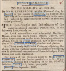 This advertisement was not only useful in its description of the Inn, which is still going strong in 2020, it also described its location in detail and we learn that by 1846 the Wilts, Somerset and Weymouth Railway had arrived in the vicinity. Thomas was obviously promoting the proximity to the railways as a means of the tenant making an excellent income from travellers to the area. The advertisement also highlighted the expansion of railways in the 1840s and provided clues for further research, either for someone who worked for the railway company or used the railway to move elsewhere. Together these two advertisements provided a lot of contextual information for Thomas Samways, who retained his profession as plumber and glazier while building up a portfolio of property as a means of increasing his income.