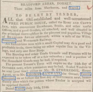 Thomas had other property interests as well as that in Middle Street, Yeovil. In 1846, and again in 1852, he advertised the lease of the Rose and Crown Inn in Bradford Abbas in Dorset, which he owned. In 1846, this was described in glowing terms: “Rose and Crown Inn, with convenient Brewhouse, Stable, and other useful Offices, and a good Garden, all attached, and well situated in the principal thoroughfare in the pleasant and populous Village of Bradford Abbas…”