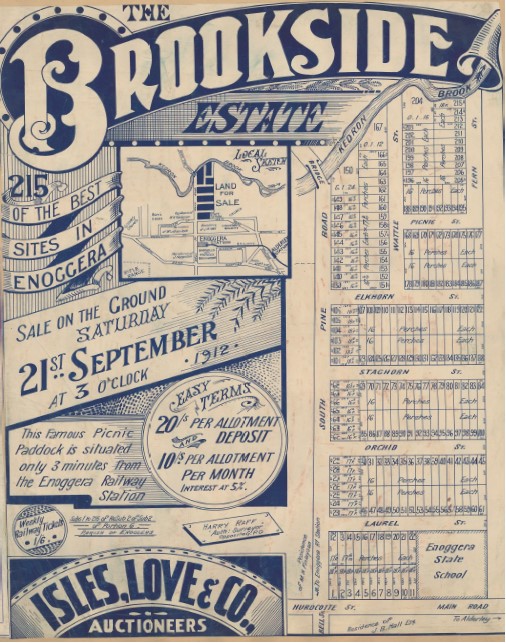State Library has hundreds of estate maps showing first sales of residential blocks in Queensland. In this estate map the sketch of the local area puts the streets in context. Cheap, easy transport was a selling point when private transport was rare. Convenience and pleasant surroundings were key attractions. The estate maps, referred to as lithographs, were supported with newspaper advertising which ran over weeks.