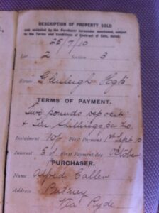 On 2nd January 1909, Alfred married Edith Matilda Bulmer at the Whitefield Congregational Church in Sydney. The following year he paid a £2 deposit on a ½ acre block in Pellisier Road Putney in the newly subdivided “Glenleigh Estate”. He then paid 10 shillings a month with interest set at 5% for his block. The elevated estate of “orchard blocks” fronted the Paramatta River and had easy access to the Putney Wharf, the vehicular punt across the river and the new Ryde Tram.5,6