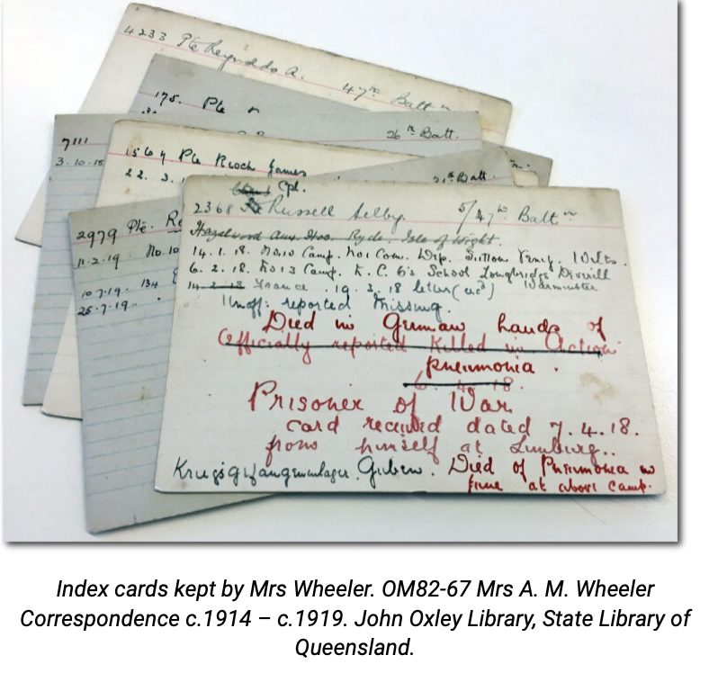Working on the Wheeler Project is a visceral experience. The NAA files include enlistment documents that give a glimpse into the pre-war lives of Queenslanders – station-hands, shearers, railway porters, postal workers, nurses and doctors, cooks, solicitors, graziers. The NAA files also include poignant letters seeking information on the whereabouts of soldiers and nurses: “I have had no word from my son but Mrs Wheeler tells me that he is in [such and such a battalion] stationed in France…”. Mrs Wheeler kept track of their whereabouts – where they were last known to have been stationed, their forwarding addresses, whether they were wounded or captured or killed in action, the names and addresses of their family members and friends.