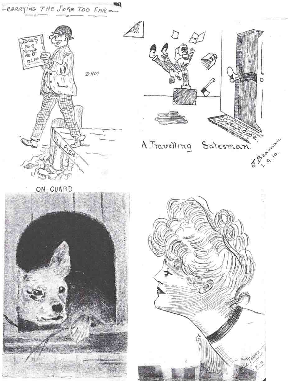 Top Right: Another sketch ‘A Travelling Salesman’ by James Beaman done on 7 Sept 1910. Remember that at this period it was common for travelers to walk around selling their products door to door, and they weren’t always welcomed.