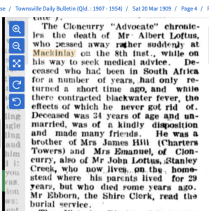 In December 1908, Albert and Dick Williams were working at the Gilliat River on the Eddington Road, some 60 km north of Mackinlay, putting in two new crossings. They worked until about 3 February when Albert took ill. Hoping that his illness would wear off, he continued to work but a few days later reported feeling very bad and Dick advised him to “knock off” for the day. Dick suggested that Albert should ride in to town and take a train to Cloncurry to see a doctor but Albert said that he would “fight against it and work it off” adding that it was South African fever which he had contracted while living there. They returned to Mackinlay on about 9 February.