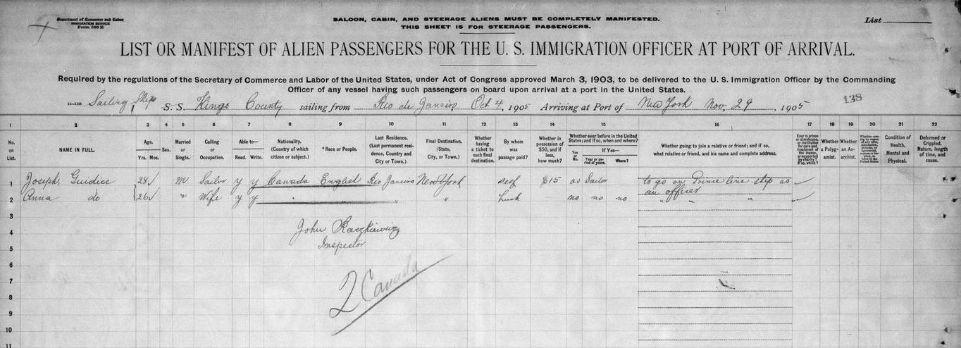 Joe’s record has some large gaps in it, but it is consistent as every record found listing Joe Guidice in this investigation, is chronologically sound. He does not appear in two different places at the same time. Whether he is listed in New York, Rio de Janeiro, Talana Chile, or Brisbane and Sydney in Australia, there is no overlap. Additionally, Joe always identified as a French Canadian, my conclusion is that these records all relate to the same person, even if widely separated around the world. Joe was a travelling man.