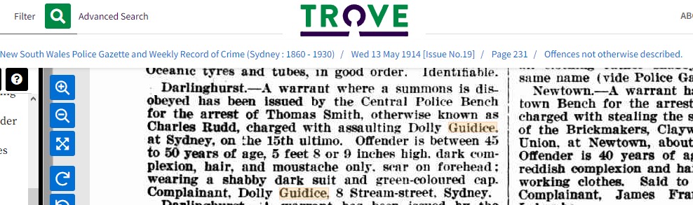 Dolly followed Joe to Sydney when he moved there. She is the Dolly named as Joe’s wife on his Attestation papers, although they were not married. Joe even stated this in one of the newspaper articles he was mentioned in, but why all these newspaper articles? Joe and Dolly had a very rocky, on-off relationship over a 7 to 8 year period, with her leaving him at times for up to a month, but always coming back. Dolly had a liking for drink, was charged with stealing at least once, was suspected of being a casual prostitute, and was possibly assaulted by Joe on at least one occasion. All these things led to court appearances and made for good newspaper copy; reporters then, as now, knew a good story when they saw one.
