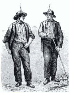 How many questions can you think of asking in this review? For example, what did Cornish miners look like would be one of my questions? What was it like in the mines? In the drawing to the right, I was intrigued by their mining hats and what was on the top. A candle, what else? How could they see below ground without a candle? Not sure I could go about my daily tasks with a lit candle on my head.
