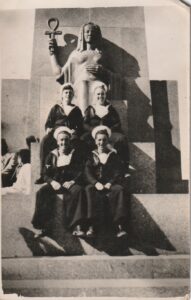 The other item that I brought back to Australia was my dad’s photo album. He had acquired this photo album in North Africa. It had been left behind in barracks when RN sailors were recalled to their ships for patrolling in the Mediterranean during WW2. This album contains vivid black and white photos of warfare in the Mediterranean. As well, there are aerial photos of pyramids and other places in North Africa. These had been taken by the original owner of the album. Dad never found the original owner, so he used the album for his own photos taken during his Royal Navy service in the Mediterranean. One delightful photo is of him sitting on a monument in Egypt with three friends and others are recorded as being taken in Cairo and Alexandria. He never spoke of these experiences, although he often declared that he had visited North Africa during the war and had no desire to return.