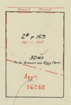 Jane Ezzy was the first woman to be granted 30 acres/12 hectares of land in the Hawkesbury district, promised in 1795, made official in May 1797. The records found through the Historical Land Records Viewer at NSW Land Registry Services for Jane Ezzy provide a sketch of the land, lease documents from the Grant Register and dates of land transactions.[6] In 1800, Jane was recorded in the Muster as having planted 9 acres/3.5 hectares of wheat, 1 acre/.4 hectares of barley and prepared another 4 acres/1.5 hectares ready for maize, as well as holding 14 pigs.[7]