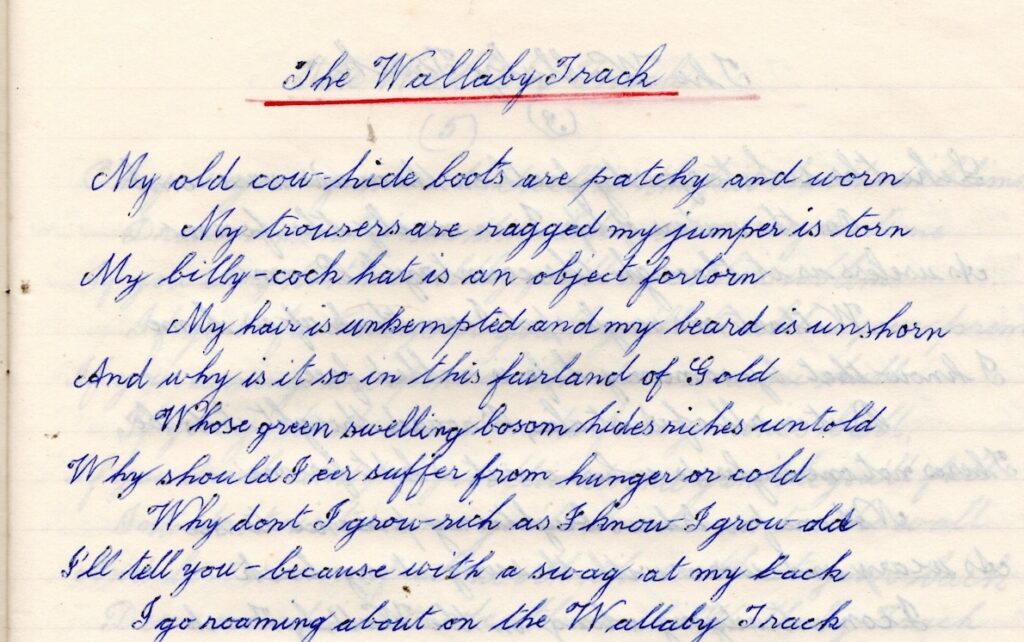 This sample of poetry, carefully copied into a school exercise book by his grandson, Philip, came from an original collection of twenty poems gathered by Francis Theobald Heffernan, my great-grandfather. His original book is held within one branch of his descendants. Australian poets, Andrew B (Banjo) Paterson and Will Ogilvie feature, having written a third of the poems in the collection. Several named poets are not well known; others have pseudonyms. Some of these poems appeared in The Bulletin, the magazine so loved by bushmen in the nineteenth century; the authors of several others have not been able to be traced. ‘The Wallaby Track’ was printed in a local newspaper, attributed to ‘Sundowner’.[1]