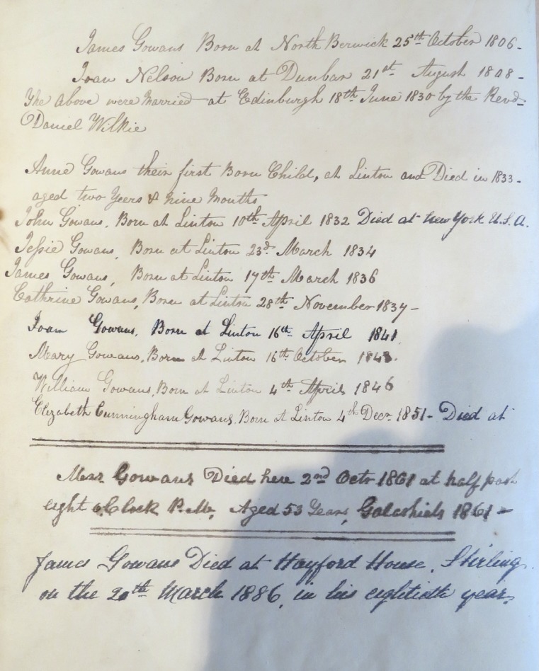 James Gowans (1806-1886), the clock’s maker is my husband’s 3rd great-grandfather. The son of John Gowans and Janet Sibbald he was born in North Berwick. James had nine children with Joan Neilson whom he married in 1830. Their descendants can now be found in Australia, Canada, England, New Zealand, Scotland, South Africa and the United States.