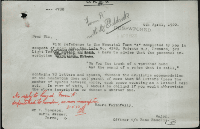 As this notice sent to William Townson at Darra on 6th April 1922 reveals, Stanley’s father’s request for these words to be added to his son’s memorial was not accepted as it did not meet official requirements. [2] William, born in Salford, Lancashire was an avid letter writer and often included extracts from poetry in his correspondence. He selected these words from Alfred, Lord Tennyson’s poem Break, Break, Break for the memorial to the second son he had lost in World War I.