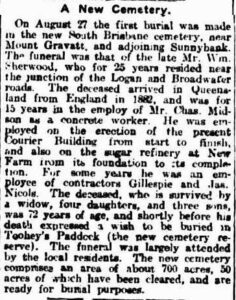 So what did William Sherwood do to have this honour bestowed on him so long after his death? Well, he was the first person to be buried in the new South Brisbane cemetery, near Mount Gravatt and adjoining Sunnybank. The day after his death, on the 27 August, 1918, William Sherwood was buried where he had requested shortly before his death – in Toohey’s Paddock (the new Cemetery reserve).