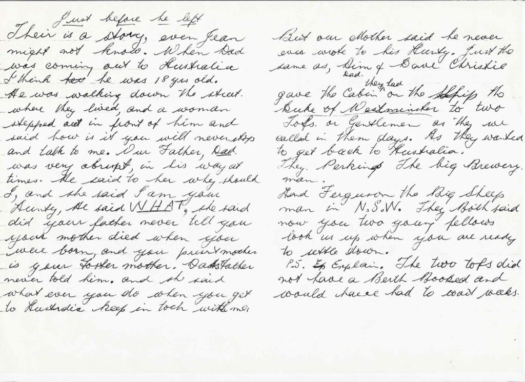 It started with a note, a small, white piece of what looked like scrap paper, with handwriting that seemed slightly familiar but we couldn’t quite place. The note was a short recollection of my great grandfather’s life, telling us of family interaction in Scotland and the people he met on the voyage out to Australia. Most tellingly, this short, seemingly innocuous document, called into question his maternity.