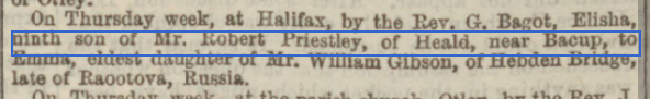 My interest in the Priestley family began with a newspaper notice about the wedding of Emma Gibson, daughter of William Gibson of Hebden Bridge, late of Raootova, Russia to Elisha, the ninth son of Robert Priestley which appeared in the Leeds Times of 11 June 1864. I found elsewhere a comment that Jared had worked in Russia.