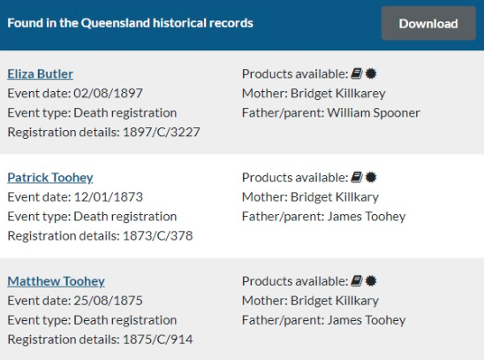 A word of thanks to the wonderful people at the Queensland Births Deaths and Marriages for the wonderful database which is searchable in so many ways and without which I would never have found Eliza’s half-brothers. That’s my story and I am sticking to it.