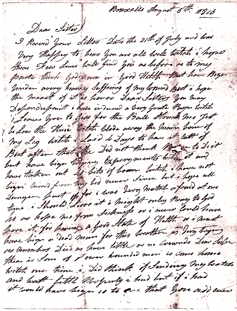 Written from Brussels on 5 Aug 1815 to his sister Amy, who had married William Jacobs in 1813, her eldest brother Thomas began by thanking her for her letter of 21st July, and said he was ‘fine’. Then he went on to describe how the ‘ball’ had struck him just below the knee which blew away the main leg bone. He waited for 4 days to have it cut off, but then the doctors decided to experiment and took out 40 pieces of bone. It seems he was then bed-ridden and said that the weather had been extreme and many of his fellow soldiers had died with little or no wounds.