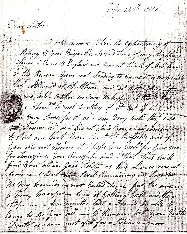 Addressed to ‘Dear Sisters’ on 14 July 1816, it seems Thomas had written after returning to England but not had a response, although he had been in Chatham a month. Not having heard obviously upset him and he apologised for not responding to any letters except for the one sent to Brussels. His wound hadn’t healed, and he was not fit to be a soldier now, and at that point had not had any settlement from the regiment. He asked if his sister Marey (Mary) was married or not and how his mother and brothers were. Pleading for them to write by return of post to Port Pitt Hospital, Chatham, Kent.