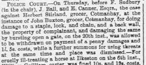 The third case was some years later in 1898 and heard at the Derby Police Court. This case was reported in the Derby Mercury of 1 June 1898. This time Herbert was charged by another grocer of Cotmanhay, John Buxton, for damaging a staple, lock and chain and a back wall. The charge was withdrawn after Herbert paid a penny in damages and £1 5s costs. A further summons for using threats at the same time and place was dismissed.