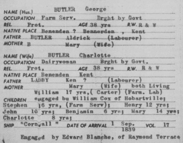 George and Charlotte and their seven children were on this ship as Assisted Migrants, arriving in Sydney on 1 September 1839. Their Arrival Card shows that George was a 38 year-old Farm Servant brought by the Government to work for Edward Blanche of Raymond Terrace. Who was Edward Blanche and where was he farming? An Edward Blanche, 26, arrived in Sydney on the Cornwall with the Butlers as an assisted migrant and a Farm Worker. Surely he didn’t own a farm where he could employ George? Edward’s father was also Edward Blanche and he arrived as an assisted migrant on the Maitland in November 1838. He was 50, Baptist and he could read. Raymond Terrace is a town at the meeting of the Hunter and Williams River and it became famous for the production of wine in 1834. So I imagine that Edward Senior headed up to the Hunter when he arrived and acquired a farm for which he needed labourers so he arranged for his son, Edward, and George Butler to come as assisted migrants twelve months later. They were all from Kent – did they know each other before they immigrated? I wonder? Edward Senior died in Raymond Terrace, Tamworth in 1860 so it is possible that he moved north and named Raymond Terrace after the one where he got his start.