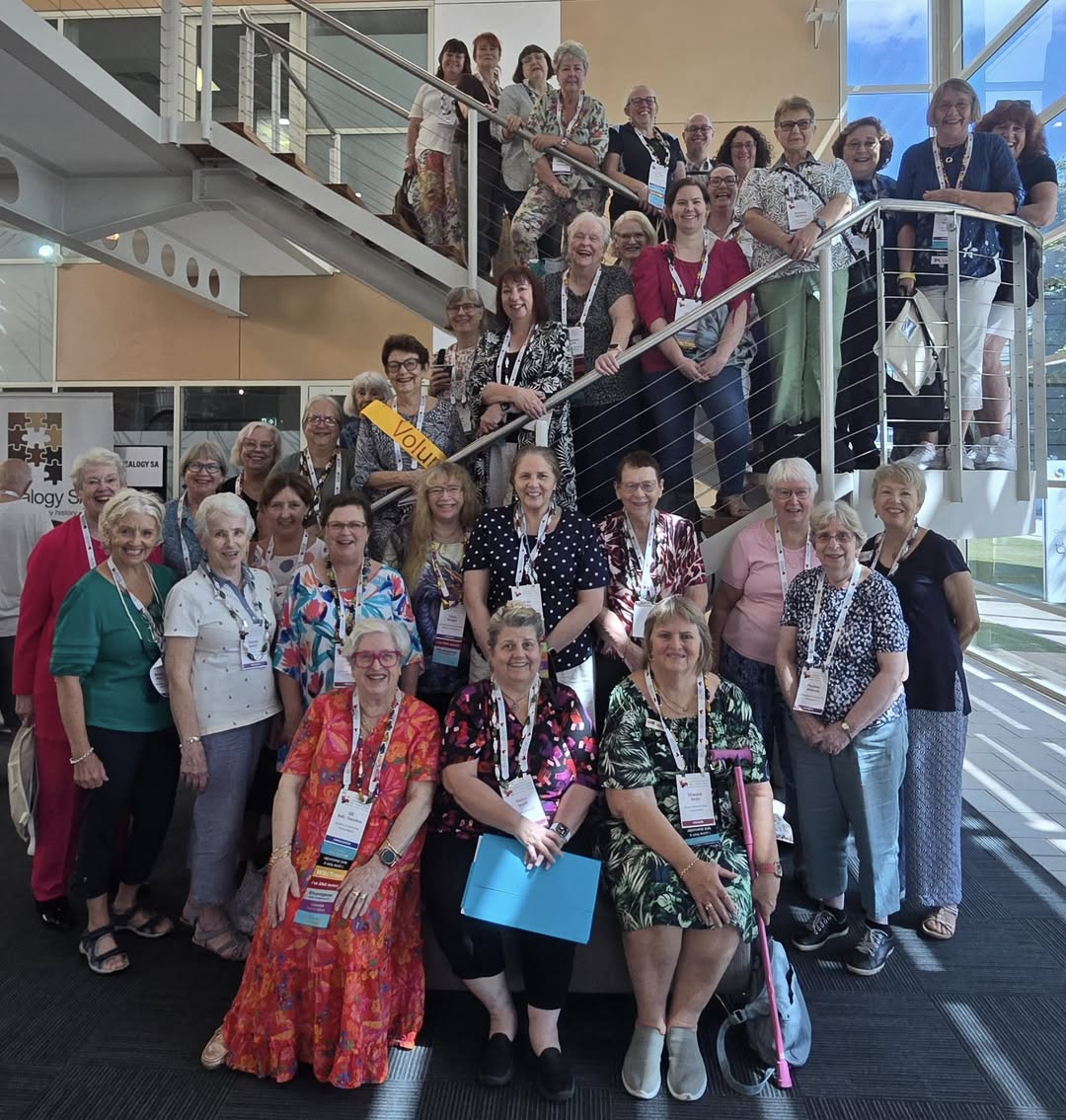 For me, one of the most heart-warming benefits of conventions is reconnecting with old friends, especially interstate and co-presenters from all over the world. While audiences are introduced to speakers, our supporters remain unknown parties. We mainly rely on eye-contact during lectures and cannot always immediately recognize everyone who has asked questions on former occasions or who have emailed for advice or have bumped into us in crowded repositories. Each reunion is valuable even if instant recall may need prompting by mentioning problems solved. We rarely forget those ancestors whom we have scrutinized and I count many of these and their diligent descendants as close companions. Some names or faces may be familiar through society journals or newsletters and we feel we know them well even though we have never been officially introduced. Others we have met at conferences in quite distant locations and these shared experiences contribute significantly to our well-being. People bound by activities get together such as the bead-bedecked bloggers. Further, gatherings give the opportunity to congratulate people on jobs well done or results obtained. Boosting and appreciating volunteers and recognizing contributions is important to members of all societies.