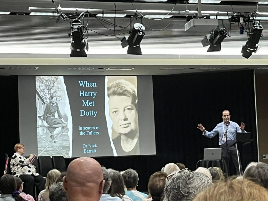 Near the registration booths several stalls demonstrated work by professional services, with several societies advising of specialized activities and research support, while well-stocked book shops opened many wallets when tempted by the offer of, often out-of-print, reliable reference material. Why can’t I carry more? This plaintive call was accompanied often by a wistful: And where will I shelve them when finally reaching home? But I just cannot resist this bargain. Also how wonderfully reassuring to see familiar smiling faces from the State and National Archives and Library at information desks. They readily offer knowledgeable solutions to sources and how to spend your research hours most effectively.