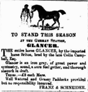 After the mission disbanded about 1850, the Franz family began breeding horses and cattle. Maurice was about 17 years old when his mother died in 1855 and by then Maurice was listed in an advertisement offering horses for stud.